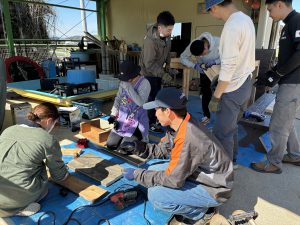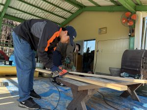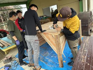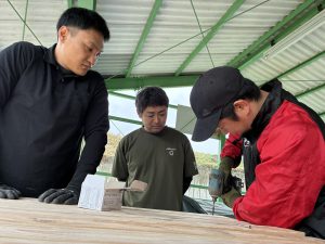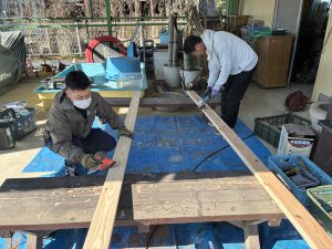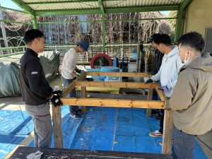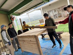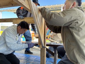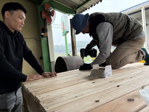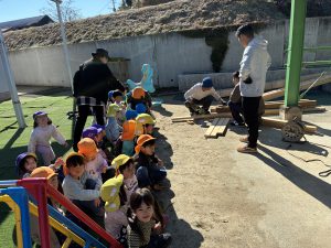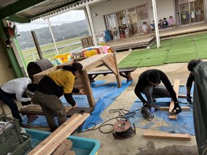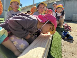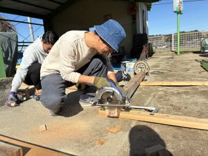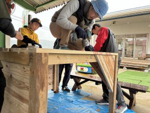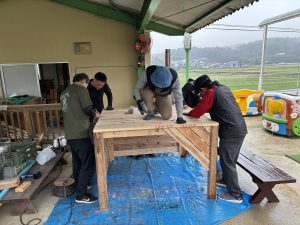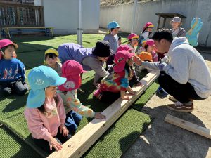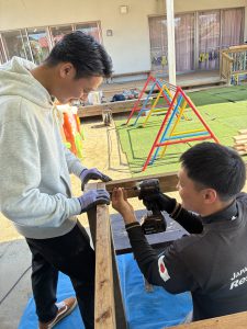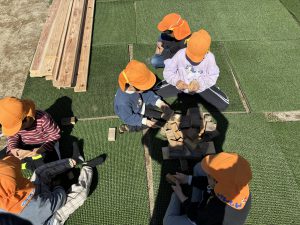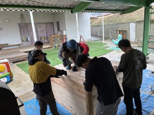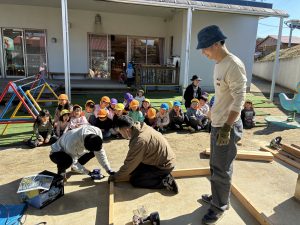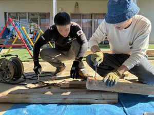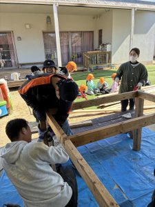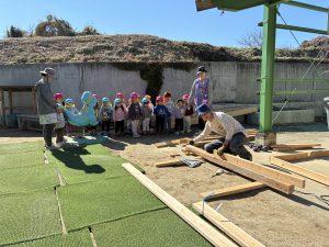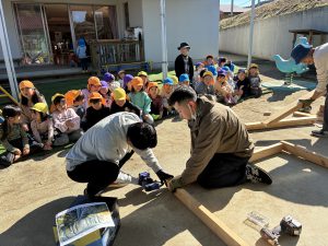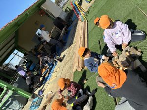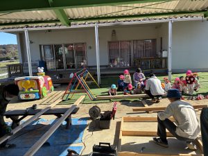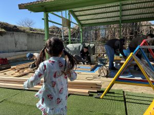 去年のウッドデッキに引き続き、今年はどんなモノが出来上がるのか、子どもも職員もドキドキわくわくで見守りました!!