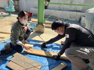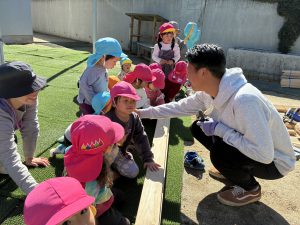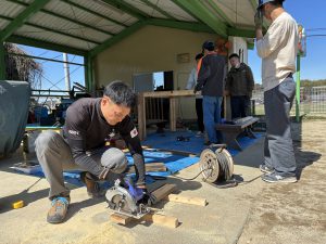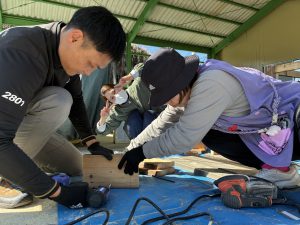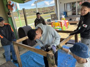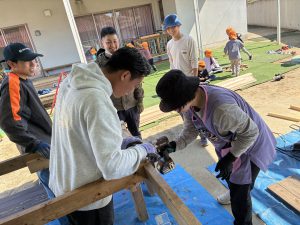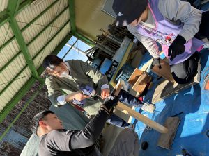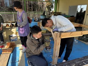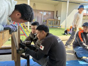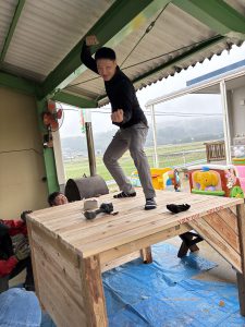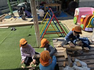 もう本当におやじの背中がカッコよすぎて惚れ惚れしました!!!子どもたちもお父さん達が頑張っているところを熱い視線と「ガンバレー!!」の声援を送り、憧れMaxで見学していました!!ひまわりさんは、破材を使ってお父さんたちの真似をして家を作り出すほど影響されていましたよ!!職員も一緒に椅子を作り、ⅮIYに目覚めたようです!!(子ども玄関の椅子です)