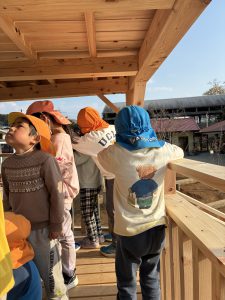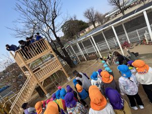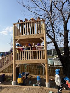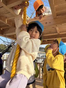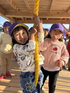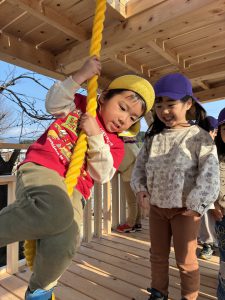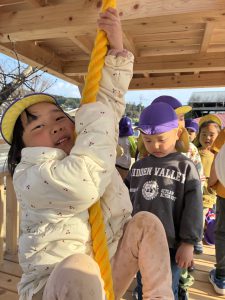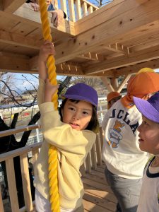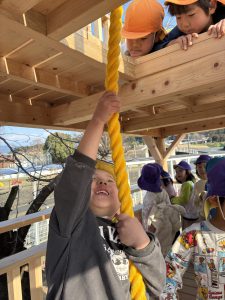 2階(天守閣と呼んでます)へはこのロープでしか上がれません!!一人ずつ頑張って挑戦しました!!簡単には天守閣に上がれないところが子どもたちの闘志に火を付けます!!本当に難しいんです!登れた子が上から「がんばれ!そこを握って!」とアドバイスしながら応援してくれます!!